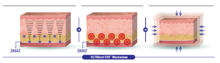 超音波を高密度に集束させてターゲットをピンポイント加熱することでコラーゲンや線維芽細胞等を新生・活性化するHIFU(高密度焦点式超音波)テクノロジーを搭載した治療機です。最大の特長は、他の施術では難しかったSMAS(筋膜)まで非侵襲で効率よく熱を与えることができる点です。侵襲を伴わない為「切らないフェイスリフト」とも呼ばれています。
