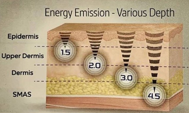 レーザー・高周波RF・高密度焦点式超音波(別名HIFU)を組み合わせた治療機器です。一言にたるみの改善といっても肌にはいくつかの層が存在します。